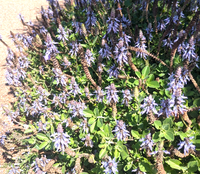 Lobster Flower: Evergreen groundcover. Flowers from spring to fall with long lasting blue colored flowers. Attracts bees. Grows to 12" tall by 36" wide. Needs good drainage. Fragrant foliage and flowers. Full sun to part shade, low to medium water.