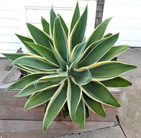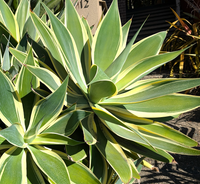 Variegated Fox Tail Agave: Rosettes with a creamy white variegation are 4-5' feet tall x 6-8' wide. Eventually will produce an arching flower stalk with greenish-yellow flowers, that rises up to 10', attracting hummingbirds and pollinators. Low water. Full sun to part shade. Great in containers. Seacoast, sand, wind, and drought tolerant once established. Deer, gopher, rabbit and fire resistant.