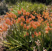 Nubian Aloe, Popcorn Aloe: Rare evergreen spreading aloe 2-3' tall, and at least as wide. Blooms coral flowers spring to summer. Great in containers. Full sun. Low water. Seacoast, wind, heat, clay, sand and drought tolerant. Deer, gopher, rabbit and fire resistant.