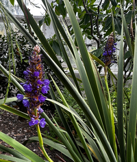 Blue Sceptre: Rare evergreen rhizomatic clumping grass-like perennial to 2–3' tall and wide, with deep blue flowers spring-summer. Attracts hummingbirds, butterflies, bees, and pollinators. Good for containers and for cut flowers. Full sun to part shade. Low to medium water. Seacoast, wind, heat, sand, clay and drought tolerant when established. Deer, gopher, rabbit and fire resistant.