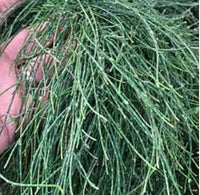 Prostrate Swamp Oak: An interesting low growing evergreen shrub with tiny needle-like blue-green densae foliage that lies nearly flat to the ground and spreads 6-8' wide or more. Good for containers and for cut foliage. Inconspicuous flowers. Full sun to part shade. Low to medium water. Seacoast, wind, sand, clay, heat, and drought tolerant when established. Deer, rabbit, gopher, and fire resistant.