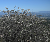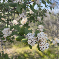 Hoaryleaf Ceanothus: CA native evergreen shrub 6-10' tall and wide with small, dense, rounded clusters of fragrant, tiny white flowers (that may have a yellowish or pink tint) in the early spring. Attracts hummingbirds, birds, butterflies and bees with their plentiful nectar and pollen. Full sun. Low water. Heat, wind, sand, clay and drought tolerant once established. Deer and fire resistant.