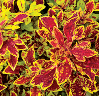 Plectranthus (Solenostemon) scutellarioides: 16" tall and wide with amber, copper, lime, and dark crimson leaves. Purple flowers may be pinched back to encourage bushiness and extend the useful life of the plant. Great in containers. Can grow indoors or outside. Hummingbird favorite. Part sun to part shade. Bright indirect light. Medium water. Heat and sand tolerant. Deer and rabbit resistant.
