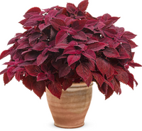 Plectranthus (Solenostemon) scutellarioides: 30" tall x 22" wide with red foliage and upright habit. Red flowers may be pinched back to encourage bushiness and extend the useful life of the plant. Great in containers. Can grow indoors or outside. Hummingbird favorite. Part sun to part shade. Bright indirect light. Medium water. Heat and sand tolerant. Deer and rabbit resistant.