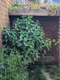 Blue Evergreen Hydrangea: Grows to 7' tall and 5' wide. Beautiful hydrangea-like blue flowers followed by attractive berries. Part sun to part shade. Medium water.