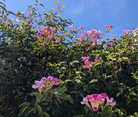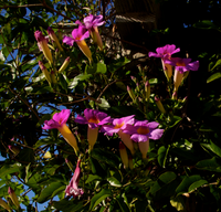 Royal Trumpet Vine: Fast growing, vigorous evergreen vine with tendrils can quickly cover walls and fences. Grows to 20' or more with clusters of showy, trumpet shaped, 4" lavendar violet flowers with yellowish throats from spring-fall. Good for cut flowers. Attracts hummingbirds, butterflies, bees, and pollinators. Full sun to part shade. Medium water. Seacoast, wind, heat, sand, clay, and drought tolerant when established. Deer, gopher and rabbit resistant.