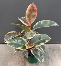Variegated Rubber Tree: Red, burgundy, pink tones on the foliage. Bright, indirect light. Well-drained soil. Low to medium watering. Allow the soil surface to dry fully before applying water. Fertilize occasionally. Toxic to pets. Can be grown outdoors in mild climates.