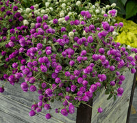 Globe Amaranth Mounding annual with plentiful small globe-shaped purple flowers on upright stems. Blooms from summer-fall. Deer and rabbit resistant. Good for containers, and cut flowers. Attracts butterflies and hummingbirds. 12-20" tall x 14" wide. Full sun to part shade. Low to medium water. Heat & drought tolerant once established
