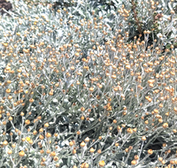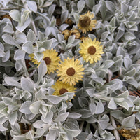 Great contrasting highlight for dry gardens, super hardy groundcover thats great for cascading. Mid-summer to fall small pale yellow strawflowers spring up, and do great as cut flowers! Needs well drained soil. Heat, deer, and drought tolerant. Grows 3" x 36" wide. Full sun and low water.