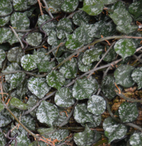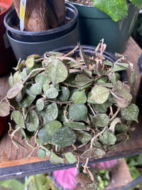 Wax Plant: Dense creeping, trailing mat of tiny, olive-green mottled, spade-shaped leaves with silver-blue variegation. Fuzzy, fragrant blooms appear once or twice a year. Flowers are white, yellow-green, or beige with a pink or red center. Great in containers or for cut flowers. attracts hummingbirds and pollinators. Can be grown indoors or outside in warm climates. Low water. Best in bright indirect light.
