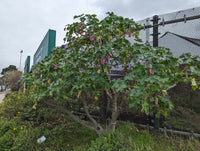 Island Mallow: Fast growing CA native perennial shrub to 10' tall and wide. Dark veined reddish-pink blooms from spring through fall. Perfect for tall hedges or screens. Attracts hummingbirds, bees and butterflies. Full to part sun. Low to medium water. Seacoast, wind, heat, sand, clay, and drought tolerant once established. Deer, rabbit and fire resistant.