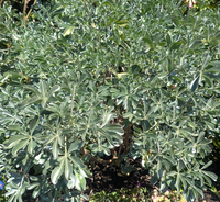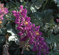 Cobb Mountain Lupine: Rare CA native evergreen perennial from the North Coast range with distintive silvery, glossy, and compact palmate foliage to 20" tall and wide, topped with 1 foot tall whorls of purple flower spikes in late spring. Full sun. Low to medium water. Attracts hummingbirds, birds, butterflies and pollinators. Good in containers. Seacoast, wind, sand, heat and drought tolerant once established. Deer, rabbit, gopher, and fire resistant.