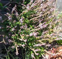 Annual or Short Lived Perennial: A sterile hybrid that blooms but does not produce seed. Stems streaked with maroon and small leaves with maroon veins and streaks on the reverse. Pinkish-lavender blooms. Great for pots & borders. 2-3' tall. Full sun. Medium water. IT GROWS WELL IN SF!