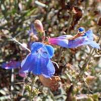 Foothill Penstemon, Blue Bedder: Evergreen CA native to coast ranges and sierra foothills. 1-2' tall x 2-3' wide. An unusual cultivar with brilliant "electric" blue flowers in late spring- early summer. Low to medium water. Good for cut flowers. Full sun to part shade. Great in containers. Attracts hummingbirds, birds, bees and butterflies. Seacoast, wind, sand, clay, heat and drought tolerant once established. Deer, gopher, rabbit and fire resistant.