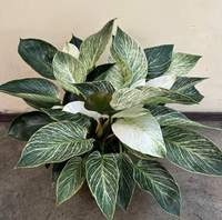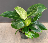 Tropical looking houseplant with variegated leaves. Rarely blooms but if it does it blooms a cream-white spadix.Prefers warmer temps, no abrupt temperature changes, bright indirect light. Wait for the soil surface to dry out before applying water.