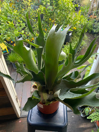 Compact Staghorn Fern: Epiphytic evergreen fern grown as a house plant or outdoor accent, forming sculptural, fronds to 2–3' tall and wide. Leaves are deeply lobed (bifurcated) and resemble deer antlers. Good for hanging baskets or mounted bark or wood either indoors or outside. Prefers part sun and bright, indirect light. Medium to high water. Appreciates high humidity. Moderately heat tolerant, and drought tolerant but prefers regular misting and lower temps. Deer and rabbit resistant.