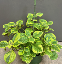 Swedish Ivy: Evergreen trailing sub shrub to 18-24" tall and wide. Creamy yellow and avocado green variegated foliage with purple underleaf, and red stems. Full sun to part shade, medium water. Good for containers, hanging baskets. Can be grown indoors or out. Attracts hummingbirds and pollinators. Seacoast, wind, heat, and drought tolerant once established. Deer and gopher resistant.