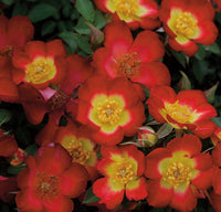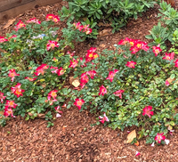 Playful Happy Trails™ Rose: True groundcover rose that hugs the ground. Small, single, yellow blossoms with a red edge that eventually turns completely red. Blooms in clusters with good repeat throughout the season. 1' tall x 2' wide, or more. Full sun. Bird, bee, and pollinator favorite. Good for containers.