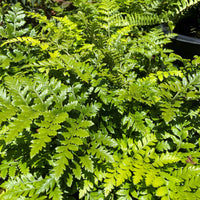 Leatherleaf Fern: Deep green, leathery fronds spreads by runners and can grow indoors or outside. Commonly used in cut flower arrangements. Easy to grow. 2-4' tall x 2-4' wide. Part sun to shade. Medium water. Seacoast, sand, clay and drought tolerant once established, but prefers occasional water. Deer, rabbit, and fire resistant