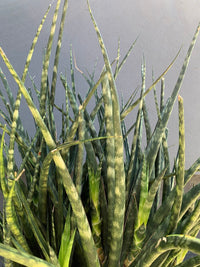Snake Plant: Evergreen. Round dark green leaves with outward curve towards the tip. If the conditions are ideal, greenish-white, fragrant blossoms on tall stalks may appear. Best with bright, indirect light. Let soil dry between waterings. Air purifying. Can be grown outdoors in mild climates. Full sun to part sun. Low water.