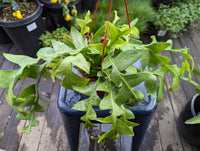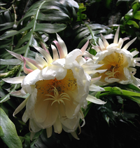Shark Tooth Cactus, Fern Leaf Cactus, Golden Heart Epiphyllum: Large, rare, epiphytic spineless cactus growing 3' tall x 6' wide with notched & lobed leaflike flat stems, commonly grown as a houseplant. Occasional white blooms that are pleasantly fragrant. Can be grown outdoors in mild climates. Great trailing plant for hanging baskets. Well drained soil. Part sun to part shade. Medium water.