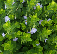 Dwarf Thunbergia: Shrubby, unbranched sub-shrub with growth to around 3' tall and wide. Lavender blue flowers with yellow throats from mid spring to summer. Best in part shade with good, rich soil and medium water. Fast growing. Cut back in winter. Attracts hummingbirds!